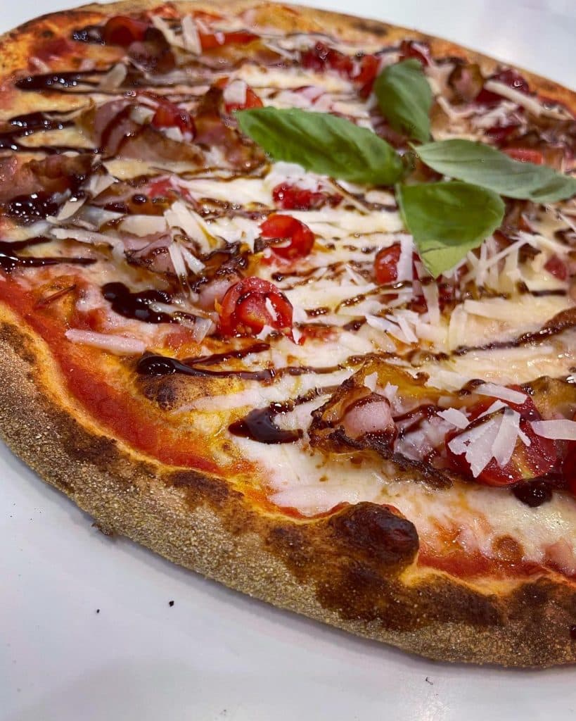 Pomodoro, mozzarella, guanciale, datteri dopo cottura, Grana a scaglie e glassa di aceto balsamico
